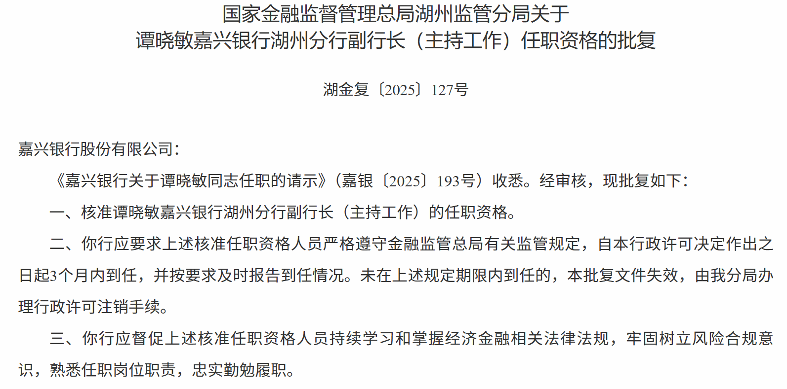 12月11日配资炒股股票,国家金融监督管理总局湖州监管分局发布关于谭晓敏嘉兴银行湖州分行副行长(主持工作)任职资格的批复,核准谭晓敏嘉兴银行湖州分行副行长(主持工作)的任职资格。